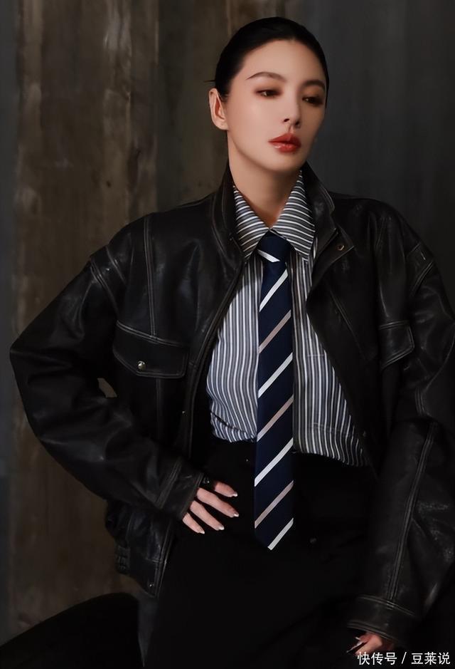穿搭也非常酷飒,内搭是一个条纹衬衫,搭配了一个蓝色的领带。 外搭是一件皮衣外套,墨镜一戴瞬间有一种“老公既视感”。 这个视频中的另外一套衣服也很好看,是英伦风的风衣,立领设计显得她的头很小。